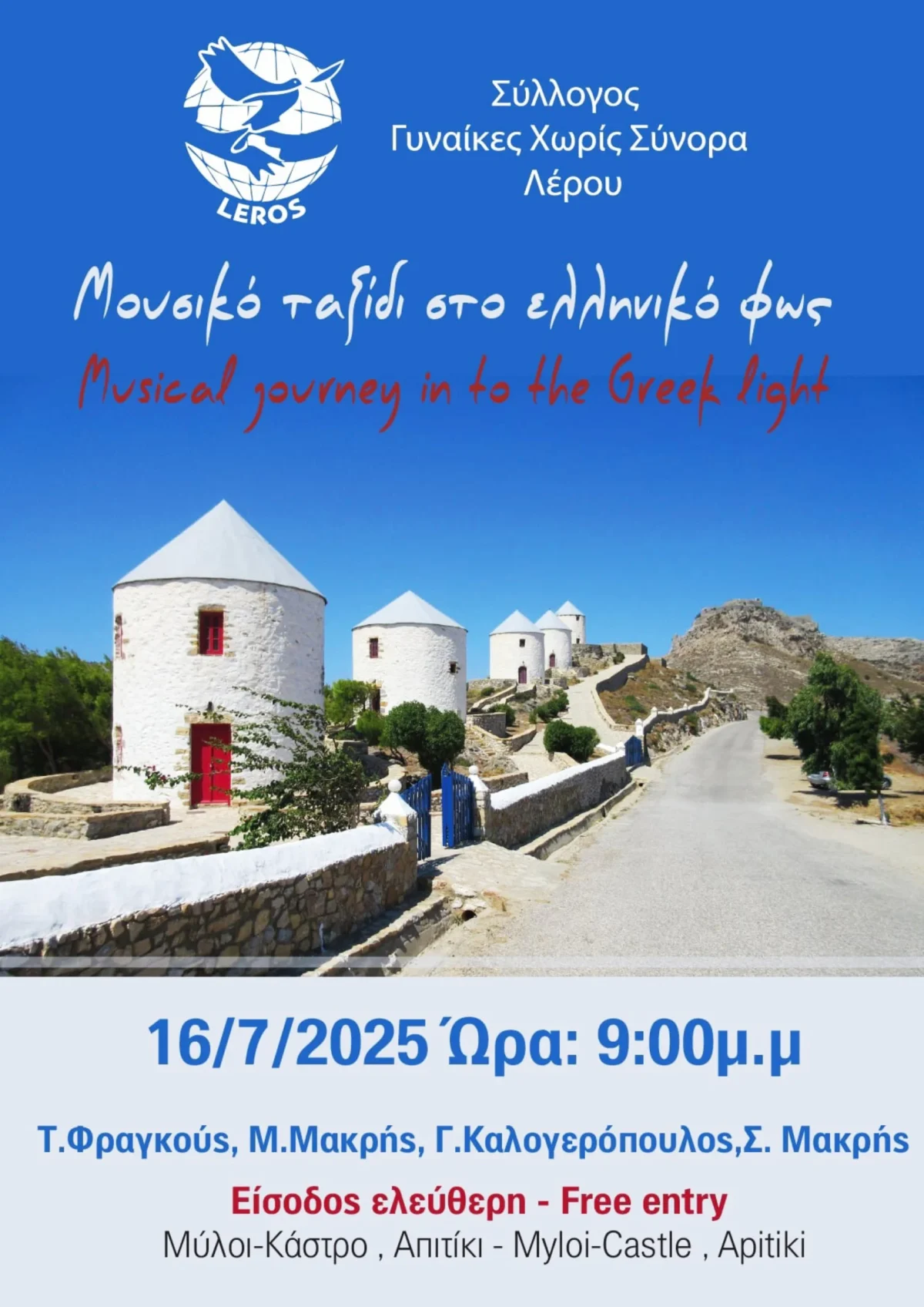 Ο σύλλογος γυναίκες χωρίς σύνορα Λέρου σας προσκαλεί σε μια μουσική βραδιά με τίτλο “Ένα μουσικό ταξίδι στο Ελληνικό φώς”.