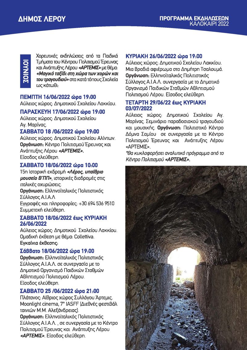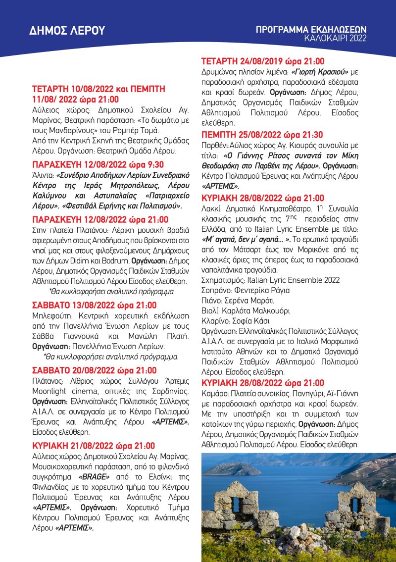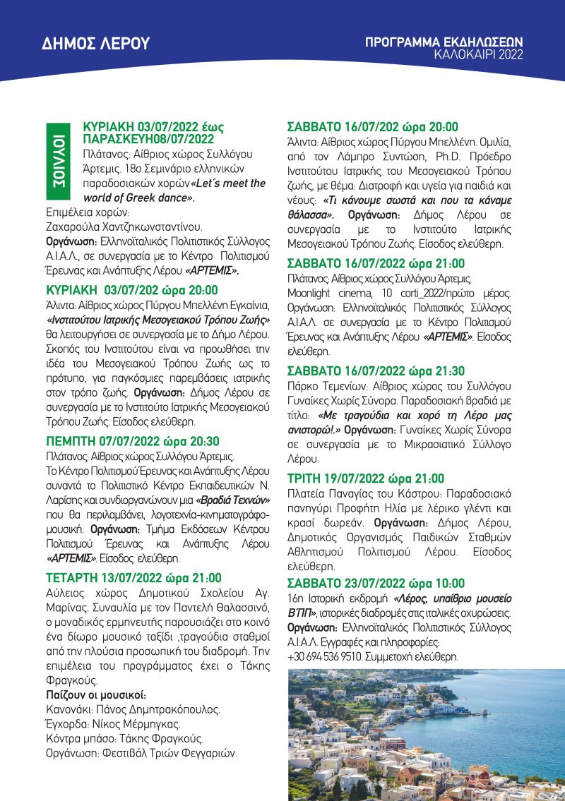 Από τον Δ.Ο.ΠΑΙ.Σ.Α.Π. Λέρου ανακοινώνεται ότι εκδόθηκε το πρόγραμμα των θερινών πολιτιστικών εκδηλώσεων 2022.