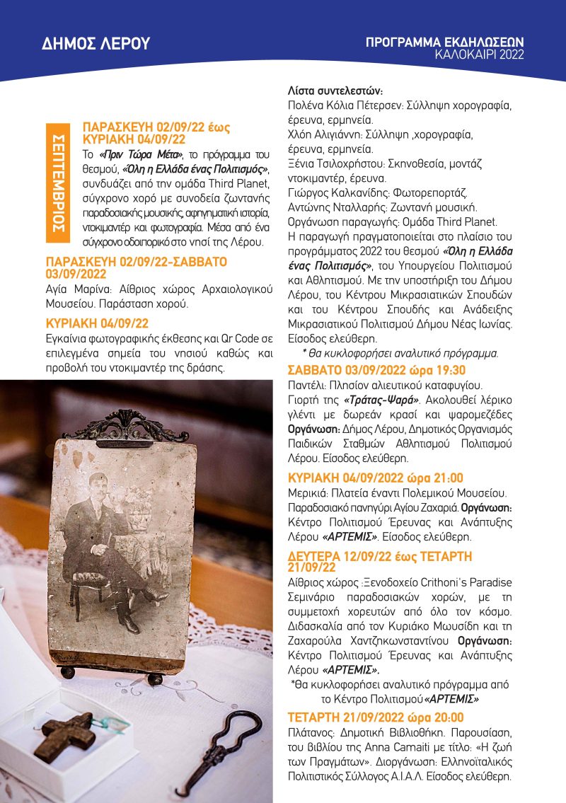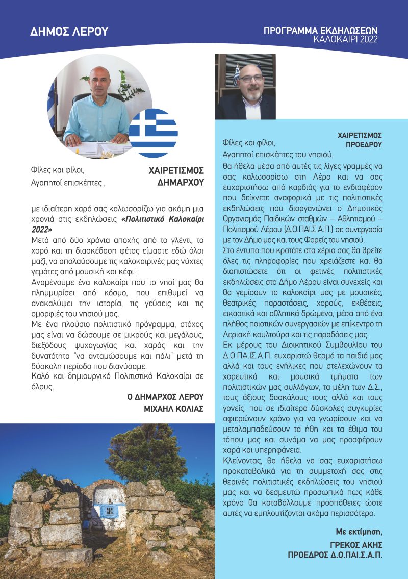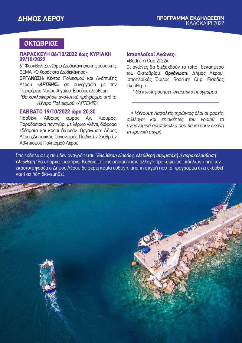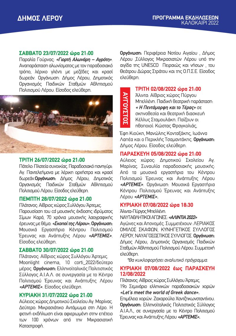 Από τον Δ.Ο.ΠΑΙ.Σ.Α.Π. Λέρου ανακοινώνεται ότι εκδόθηκε το πρόγραμμα των θερινών πολιτιστικών εκδηλώσεων 2022.