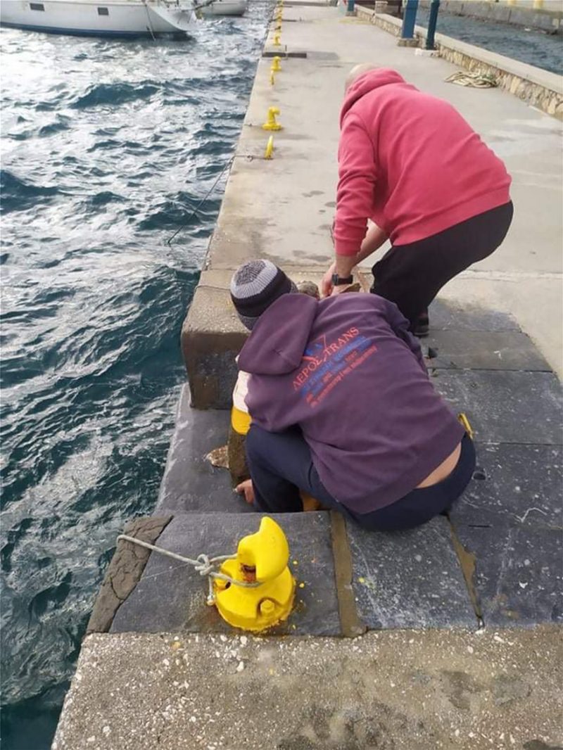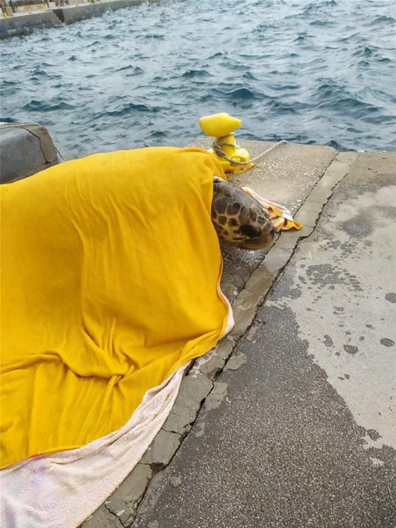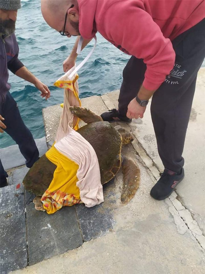 Σύμφωνα με τον κτηνίατρο του νησιού, η χελώνα λόγω της θαλασσοταραχής που επικρατεί τις τελευταίες μέρες στο νησί, βγήκε στο λιμάνι για να προστατεύσει τον εαυτό της – Δείτε φωτογραφίες
