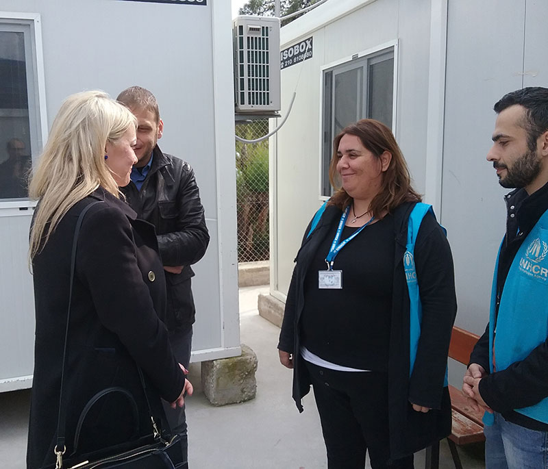 ΦΩΤΟ 1: Η Φωτεινή Παντιώρα στο Κέντρο Υποδοχής και Ταυτοποίησης στα Λέπιδα, με εκπροσώπους της Ύπατης Αρμοστείας του ΟΗΕ και τον διοικητή του Κέντρου, Β. Μιγγιάνη.