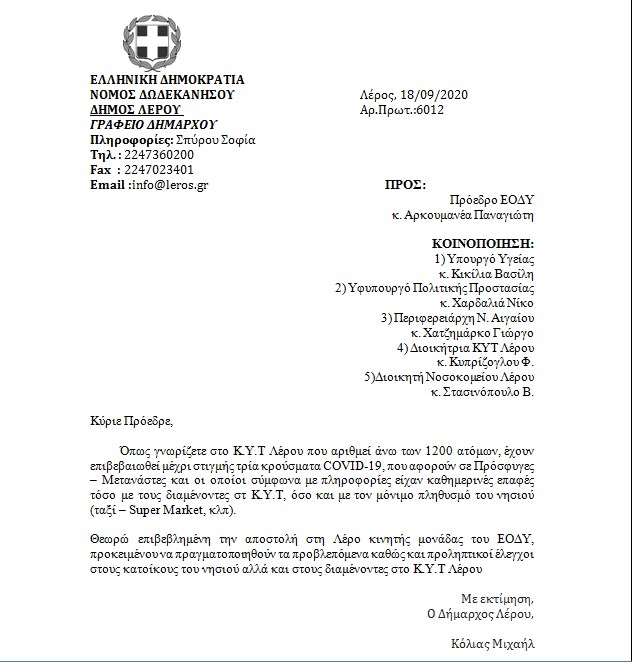 Αρχική » ΟΛΕΣ ΟΙ ΕΙΔΗΣΕΙΣ » ΤΑ ΝΕΑ ΤΗΣ ΛΕΡΟΥ » Λέρος: Επιστολή Δημάρχου στον Πρόεδρο του ΕΟΔΥ για τα κρούσματα COVID-19