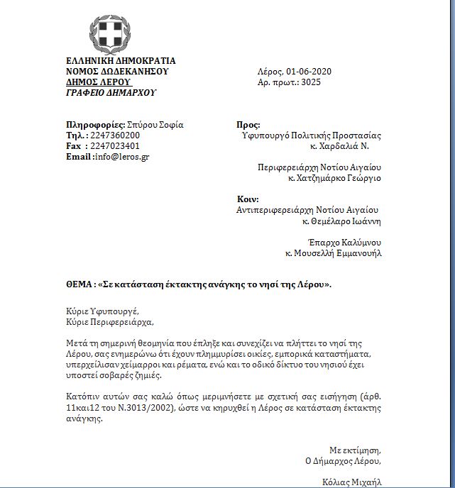 Επιστολή Δημάρχου Λέρου Κόλια Μιχάλη προς τον Υφυπουργό Πολιτικής Προστασίας και τον Περιφερειάρχη Νοτίου Αιγαίου ώστε να κηρυχθεί το νησί της Λέρου σε κατάσταση έκτακτης ανάγκης.