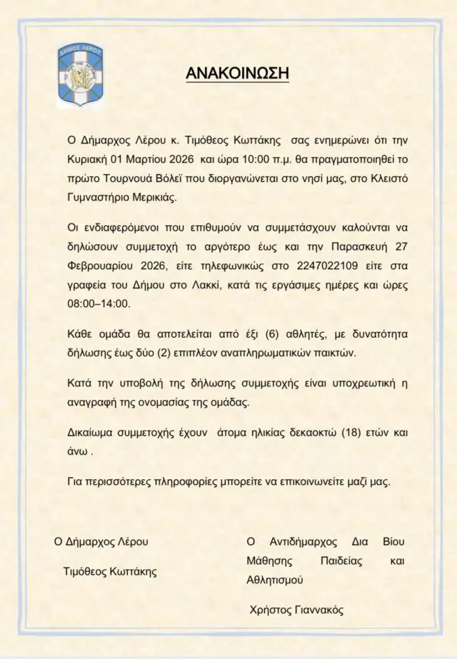 ΑΝΑΚΟΙΝΩΣΗ – Ο Δήμαρχος Λέρου κ. Τιμόθεος Κωττάκης σας ενημερώνει ότι την Κυριακή 01 Μαρτίου 2026 και ώρα 10:00 π.μ. θα πραγματοποιηθεί το πρώτο Τουρνουά Βόλεϊ που διοργανώνεται στο νησί μας, στο Κλειστό Γυμναστήριο Μερικιάς.