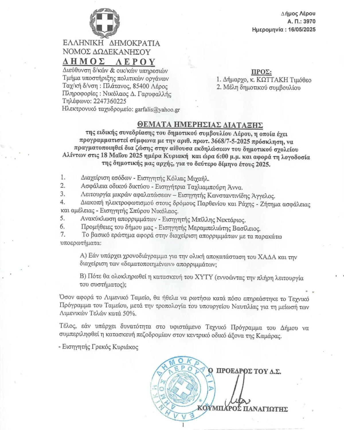 Επτά (7) ερωτήματα Δημοτικών Συμβούλων θα κληθεί να απαντήσει ο Δήμαρχος Λέρου κ. Κωττάκης στην ειδική συνεδρίαση λογοδοσίας του δημοτικού μας συμβουλίου, η οποία έχει προγραμματιστεί να πραγματοποιηθεί δια ζώσης στην αίθουσα εκδηλώσεων του δημοτικού σχολείου Αλίντων στις 18 Μαΐου 2025 ημέρα Κυριακή και ώρα 6:00 μ.μ.
