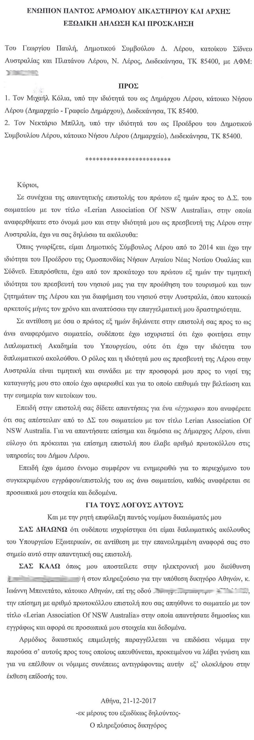 Εξώδικη Δήλωση – Πρόσκληση προς τον Δήμαρχο Λέρου κ. Μιχάλη Κόλια και τον πρώην πρόεδρο του Δημοτικού Συμβουλίου Λέρου κ. Νεκτάριο Μπίλλη απέστειλε ο δημοτικός σύμβουλος κ. Γιώργος Παυλής, σχετικά με έγγραφο του Δημάρχου Λέρου με το οποίο απαντάει στον Σύλλογο Λερίων Αυστραλίας (Lerian Association of NSW Australia) για το τίτλο του “πρεσβευτή” που φέρεται να χρησιμοποιεί ο κ. Παυλής.