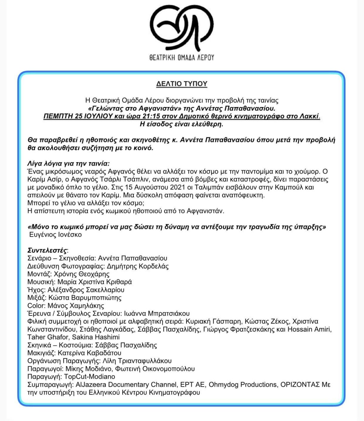 Αρχική » ΟΛΕΣ ΟΙ ΕΙΔΗΣΕΙΣ » ΤΑ ΝΕΑ ΤΗΣ ΛΕΡΟΥ » Λέρος: “Γελώντας στο Αφγανιστάν” – ΠΡΟΒΟΛΗ ΤΑΙΝΙΑΣ από την Θεατρική Ομάδα Λέρου