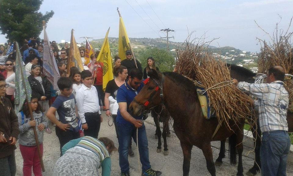 Ένα από τα «Πασχαλινά» πατροπαράδοτα έθιμα, που έχουμε στο νησί μας είναι και τα «Κλήματα». Κάθε χρόνο, την Τετάρτη του «Μεγάλου Κανόνα», τα παιδιά της ενορίας ξεχύνονται στα αμπέλια για να μαζέψουν τα ξερά βλαστάρια από τα κλήματα και να τα φέρουν στο ναό για να κάνουν τα κάρβουνα της χρονιάς για το θυμιατό της Εκκλησίας. Χρησιμοποιώντας οι πιστοί για μεταφορικά μέσα μουλάρια και γαϊδούρια, στολισμένα με σημαίες και με τις ποδιές που ξεκρεμούν από τις εικόνες, προχωρούν σε πομπή, ο ένας πίσω από τον άλλο, τραγουδώντας: