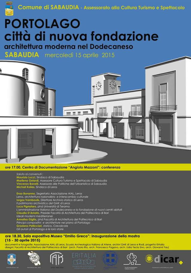 To Τοπικό Αρχείο Λέρου των Γενικών Αρχείων του Κράτους (Γ.Α.Κ.) συμμετέχουν σε Συμπόσιο-Έκθεση στην πόλη Sabaudia της Ιταλίας, μια πόλη που κτίστηκε με το ίδιο αρχιτεκτονικό (Ορθολογικό Ρασιοναλιστικό στυλ) με το Λακκί (τότε Portolago).
