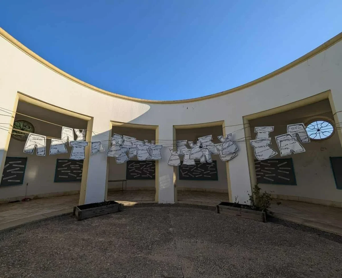 Εγκατεστημένο μέσα στο ιταλικό δημοτικό σχολείο στο Λακκί, ένα κτίριο με κυκλική αυλή που εξακολουθεί να απηχεί την αρχιτεκτονική γλώσσα και το συμβολικό αποτύπωμα του καθεστώτος του Μουσολίνι, υπάρχει μία οδυνηρή γλωσσική ιστορία. Μεταξύ 1923 και 1936 τα ελληνικά διδάσκονταν μόνο λίγες ώρες την εβδομάδα ως ξένη γλώσσα. Το 1936 απαγορεύτηκε επίσημα από τα σχολεία. Αυτό το δυνατό έργο είναι αφιερωμένο από την καλλιτέχνιδα Gülsün Karamustafa στο νησί, στα παιδιά του και σε όλες τις μητρικές γλώσσες που έχουν φιμωθεί, καταπιεστεί ή ξεχαστεί.