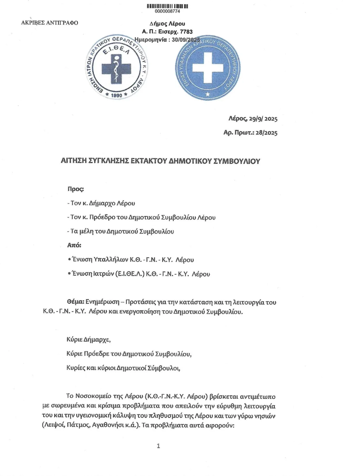 Σήμερα το πρωί κατατέθηκε από κοινού προς το Δήμο της Λέρου αίτηση για σύγκληση έκτακτου Δημοτικού Συμβουλίου από την Ένωση Υπαλλήλων και την Ένωση Ιατρών του ΚΘ-ΓΝ-ΚΥ Λέρου.