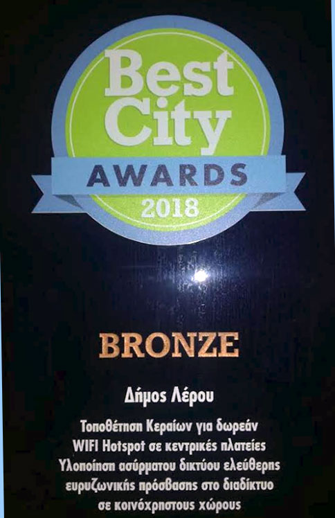 Μάλιστα, την Παρασκευή 30|11|2018, ο Δήμος Λέρου Βραβεύτηκε στην εκδήλωση Best City Awards 2018, για την υλοποίηση του συγκεκριμένου Project, στην κατηγορία “Υλοποίηση ασύρματου δικτύου ελεύθερης Ευρυζωνικής πρόσβασης στο διαδίκτυο σε κοινόχρηστους χώρους”, καταλαμβάνοντας την τρίτη θέση πανελλαδικά.