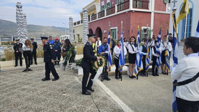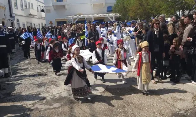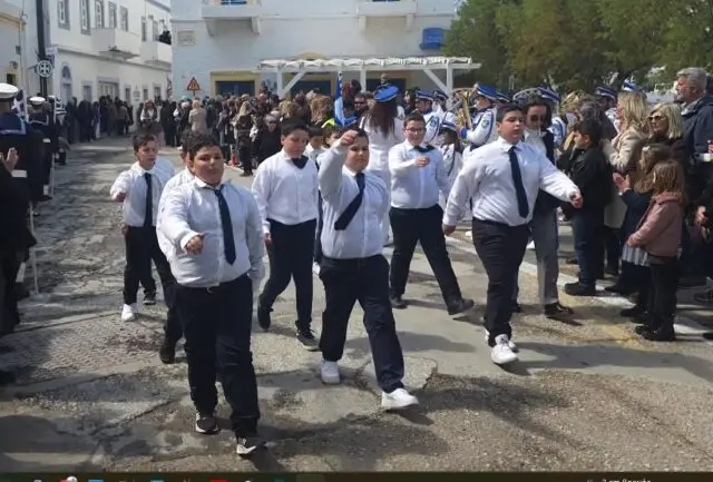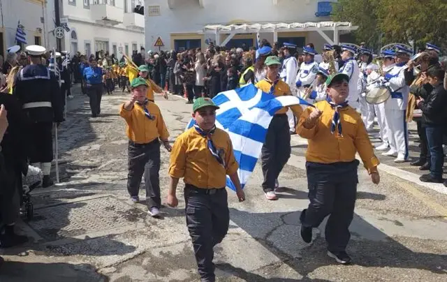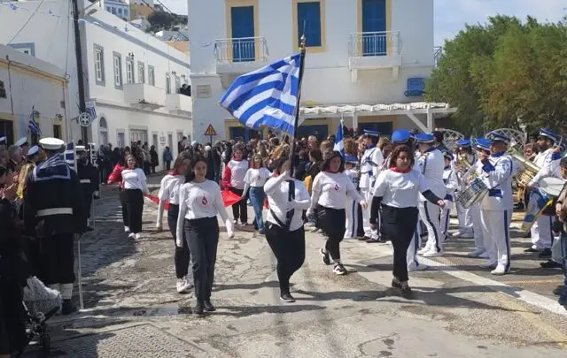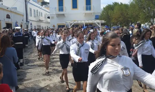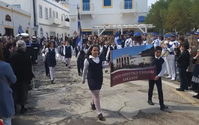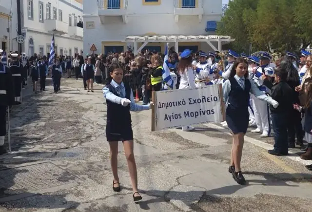Στις 11:00 το πρωί ξεκίνησε η παρέλαση, με διαδρομή από την Αγία Αικατερίνη προς το λιμάνι της Αγίας Μαρίνας. Μαθητές των Δημοτικών Σχολείων, των Γυμνασίων και των Λυκείων του νησιού παρέλασαν υπό τους ήχους των εμβατηρίων της Δημοτικής Φιλαρμονικής, ενώ τη δική τους παρουσία έδωσαν και οι διμοιρίες της Εθνοφυλακής καθώς και η αστυνομία.