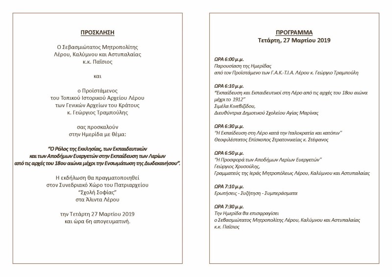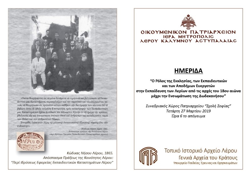 Με μεγάλη επιτυχία πραγματοποιήθηκε η Ημερίδα που διοργάνωσαν από κοινού η Ιερά Μητρόπολη Λέρου-Καλύμνου-Αστυπαλαίας και το Τοπικό Ιστορικό Αρχείο Λέρου των Γενικών Αρχείων του Κράτους, την Τετάρτη 27 Μαρτίου 2019, στο Συνεδριακό Κέντρο της Ιεράς Μητροπόλεως στα Άλιντα Λέρου.
