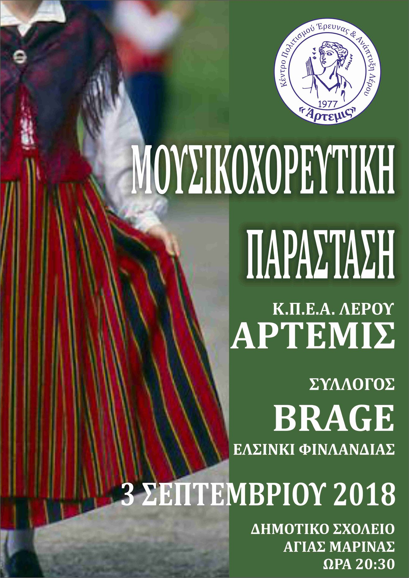 Σήμερα Δευτέρα 3 Σεπτεμβρίου 2018 στο Δημοτικό σχολείο της Αγίας Μαρίνας στις 20.30, το Κ.Π.Ε.Α.Λέρου “Άρτεμις” διοργανώνει μια μουσικοχορευτική παράσταση με το Φινλανδικό σύλλογο BRAGE, ο οποίος θα παρουσιάσει παραδοσιακούς χορούς και μουσική από την περιοχή του.