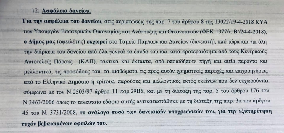 1. Στους όρους της δανειακής σύμβασης και στην παράγραφο που αφορά την ασφάλεια του δανείου που παίρνει ο Δήμος, αναφέρεται ότι δεσμεύονται και εκχωρούνται τα γενικά έσοδα του Δήμου και των Κεντρικών Αυτοτελών Πόρων ( ΚΑΠ) για 15 έτη όσο και η διάρκεια του δανείου , πράγμα που η παράταξη μας θεωρεί απαράδεκτο αφού με τα συμφέροντα του Δήμου και της κοινωνίας κανένας δεν έχει το δικαίωμα να κάνει πειράματα.