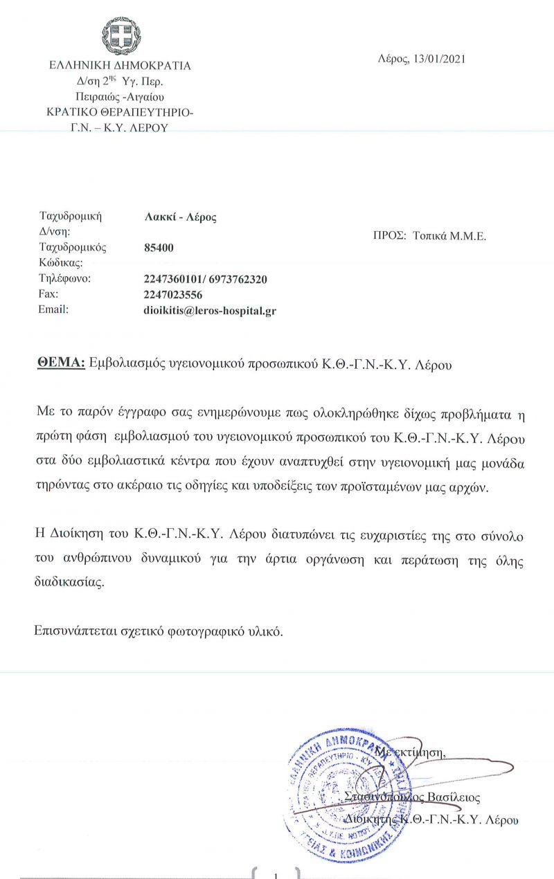 Λέρος: Ολοκληρώθηκε η πρώτη φάση εμβολιασμού του υγειονομικού προσωπικού του Νοσοκομείου