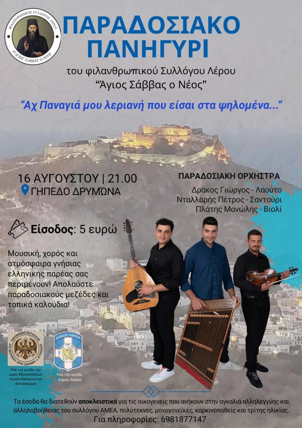Αρχική » ΟΛΕΣ ΟΙ ΕΙΔΗΣΕΙΣ » ΤΑ ΝΕΑ ΤΗΣ ΛΕΡΟΥ » Λέρος: Παραδοσιακό Πανηγύρι στον Δρυμώνα στις 16 Αυγούστου
