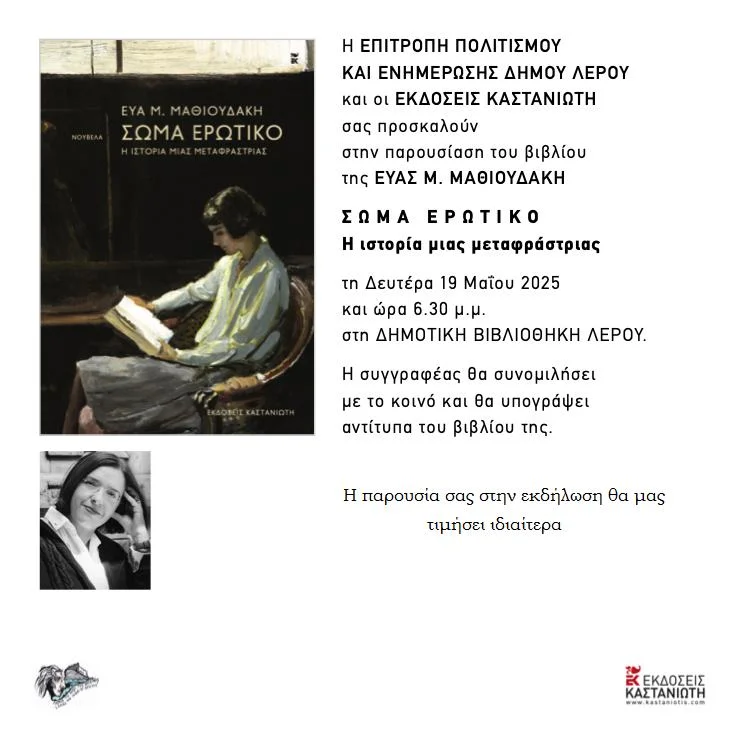 ΑΝΑΚΟΙΝΩΣΗ – Η επιτροπή Πολιτισμού και Ενημέρωσης Δήμου Λέρου και οι Εκδόσεις Καστανιώτη σας προσκαλούν στην παρουσίαση του βιβλίου της Εύας Μ. Μαθιουδάκη