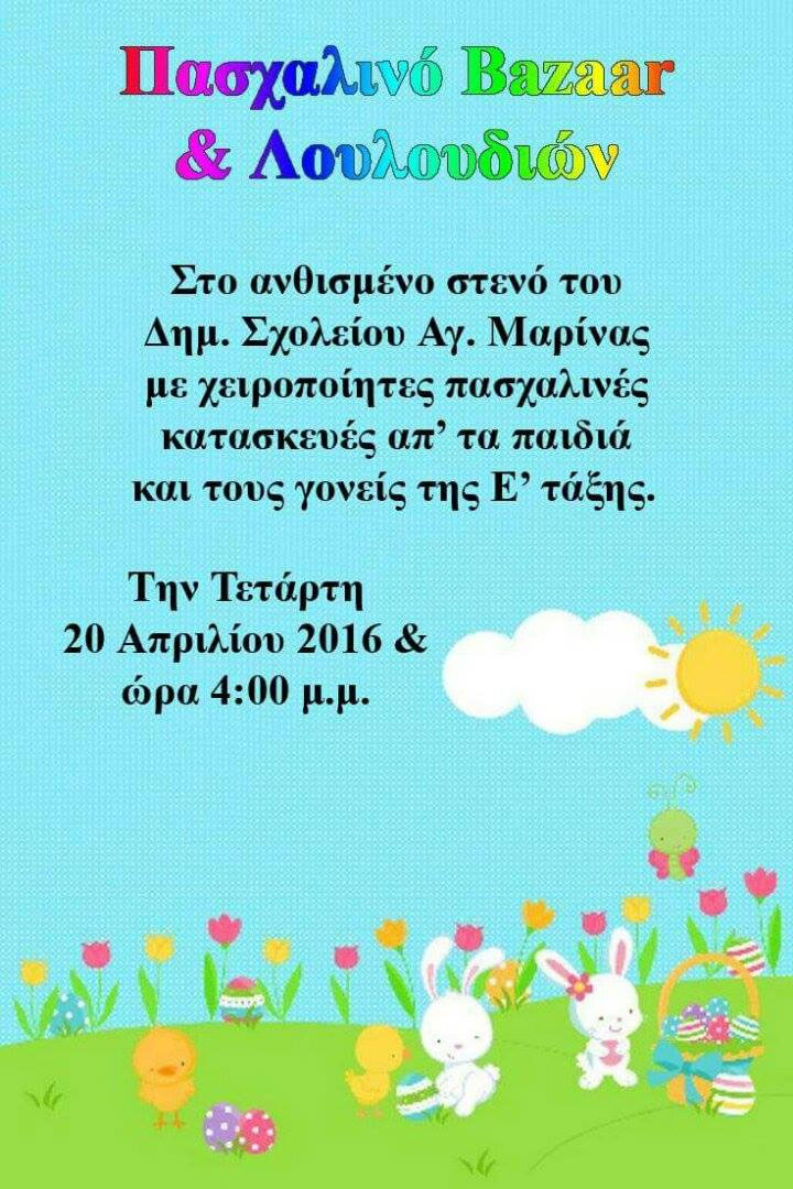 ΑΝΑΚΟΙΝΩΣΗ: Πασχαλινό Bazaar λουλουδιών στο ανθισμένο στενό του Δημοτικού Σχολείου Αγ. Μαρίνας με χειροποίητες πασχαλινές κατασκευές από τα παιδιά και τους γονείς της Ε’ Τάξης.
