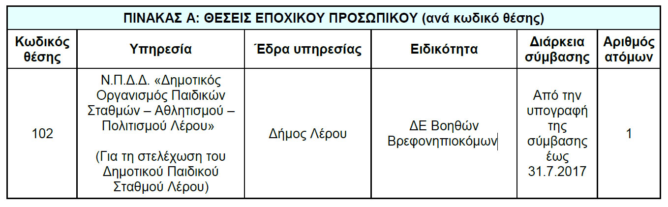 Ο ΔΗΜΟΤΙΚΟΣ ΟΡΓΑΝΙΣΜΟΣ ΠΑΙΔΙΚΩΝ ΣΤΑΘΜΩΝ – ΑΘΛΗΤΙΣΜΟΥ – ΠΟΛΙΤΙΣΜΟΥ ΛΕΡΟΥ Ανακοινώνει την πρόσληψη, με σύμβαση εργασίας ιδιωτικού δικαίου ορισμένου χρόνου, συνολικά ενός (1) ατόμου για την κάλυψη εποχικών ή παροδικών αναγκών του Δημοτικού Οργανισμού Παιδικών Σταθμών – Αθλητισμού – Πολιτισμού Λέρου, που εδρεύει στο Δήμο Λέρου, και συγκεκριμένα του εξής, ανά υπηρεσία, έδρα, ειδικότητα και διάρκεια σύμβασης, αριθμού ατόμων (βλ. ΠΙΝΑΚΑ Α), με τα αντίστοιχα απαιτούμενα (τυπικά και τυχόν πρόσθετα) προσόντα (βλ. ΠΙΝΑΚΑ Β):