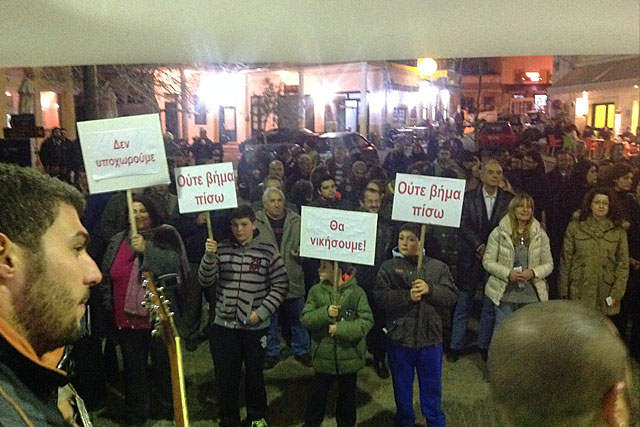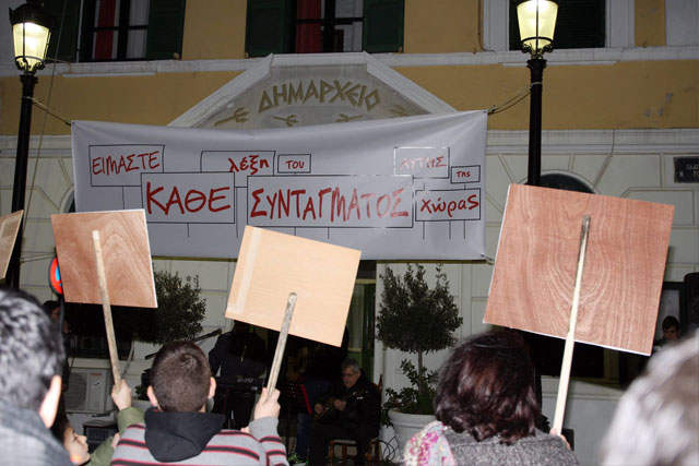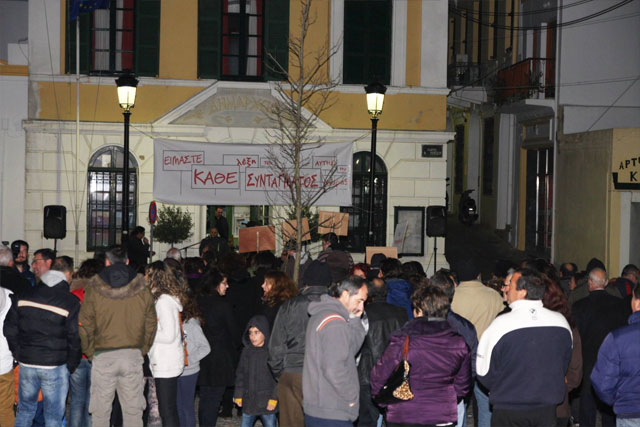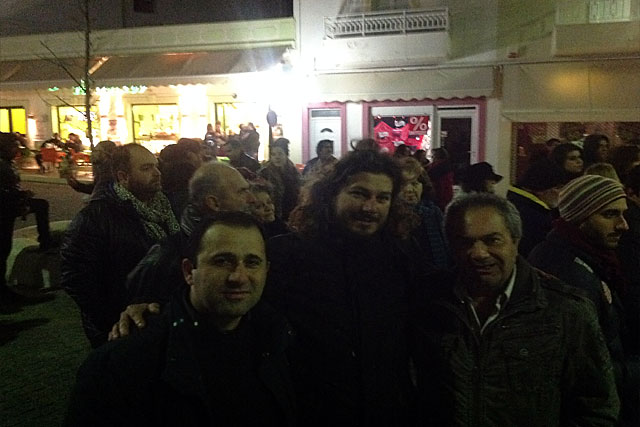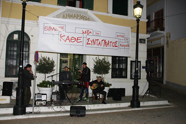 Με πλακάτ στα χέρια και συνθήματα νίκης, οι συμμετέχοντες συγκεντρώθηκαν στις 6.00 μμ έξω από το δημαρχιακό μέγαρο, όπου είχε στηθεί μικροφωνική εγκατάσταση με ζωντανή μουσική (ΦΩΤΟ).