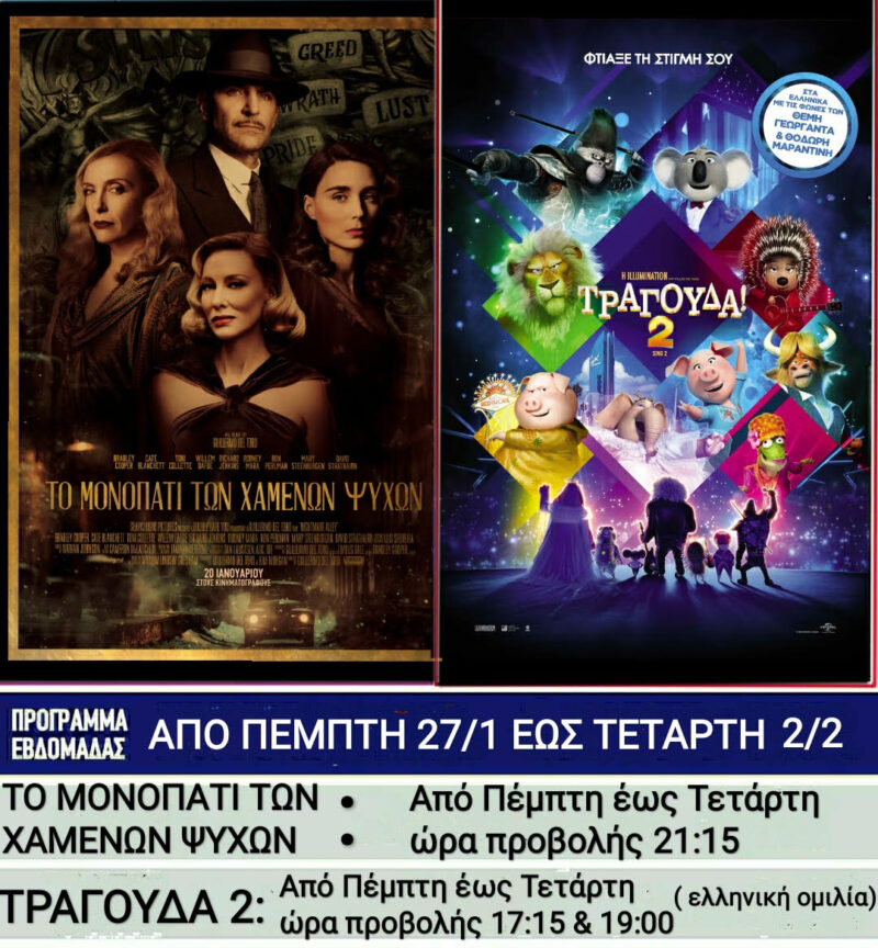 - “Τραγούδα 2 – [SING 2]” – ΚΙΝΟΥΜΕΝΑ ΣΧΕΔΙΑ – Μεταγλωττισμένο (Πέμπτη 27/1/2022 έως Τετάρτη 2/2/2022) – Ώρες προβολής: 17:15 & 19:00