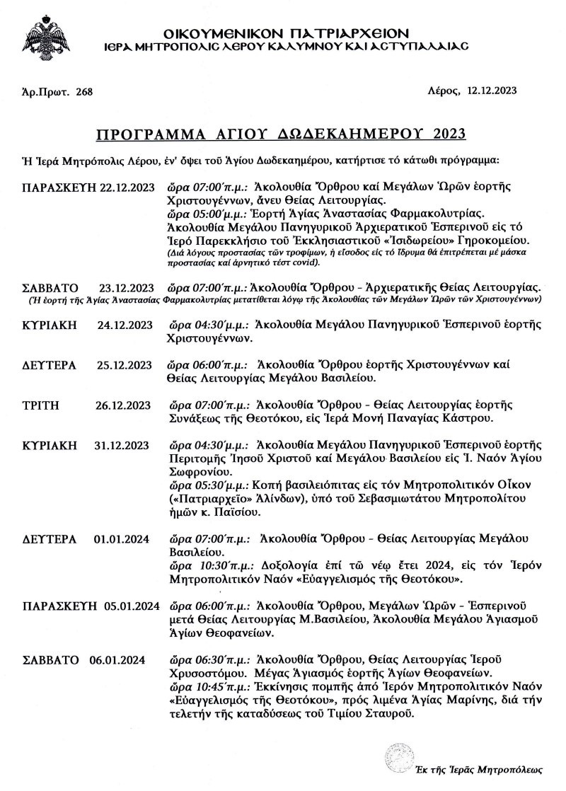 Ακολουθεί το πρόγραμμα Χριστουγέννων, Νέου Έτους και Αγίων Θεοφανείων: