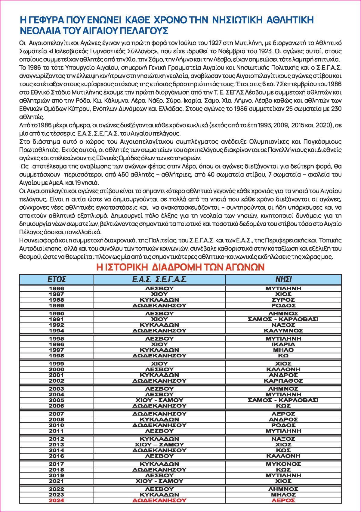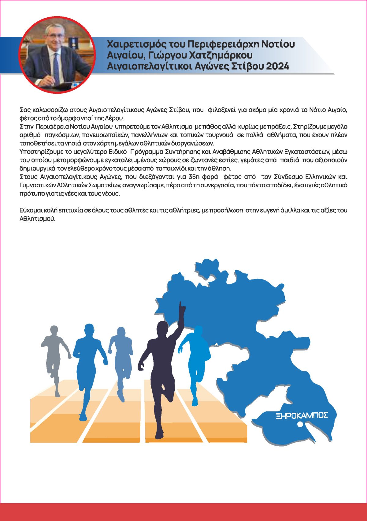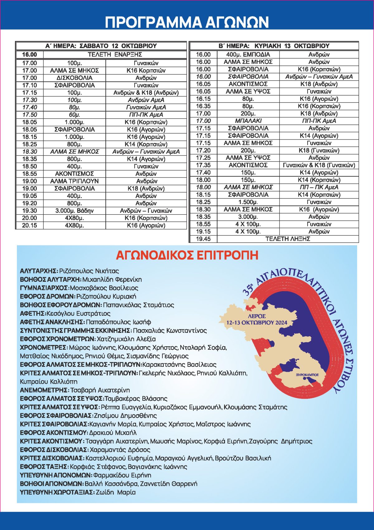 Καταρτίστηκε το πρόγραμμα των 35ων Αιγαιοπελαγίτικων Αγώνων Στίβου, που θα πραγματοποιηθούν το ερχόμενο Σαββατοκύριακο 12 και 13 Οκτωβρίου 2024 στο δημοτικό στάδιο του Ξηροκάμπου.