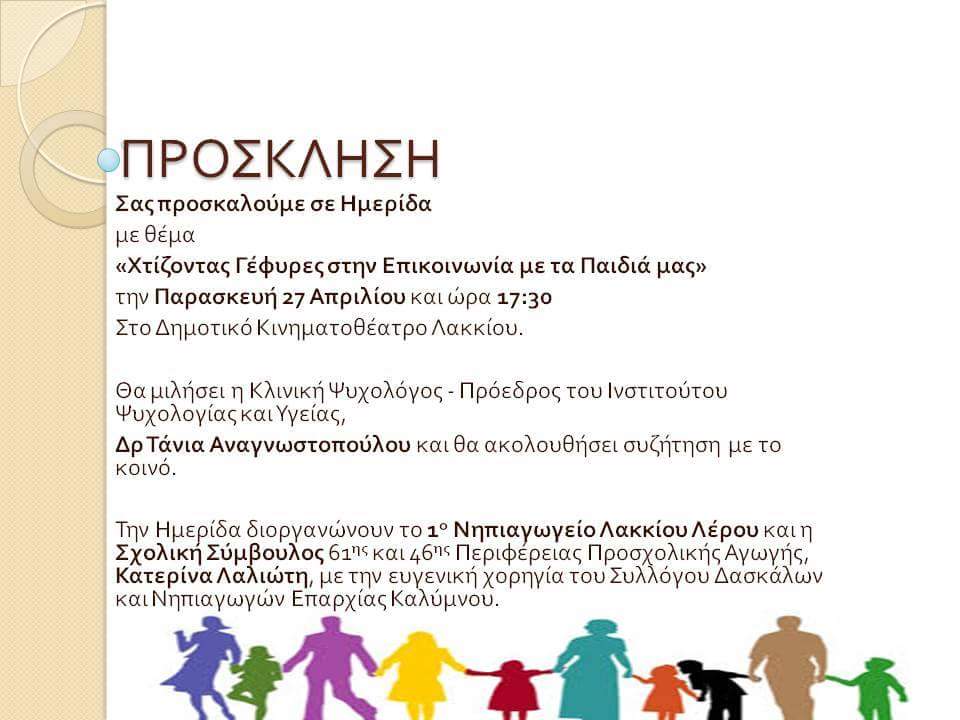 Την Ημερίδα διοργανώνουν το 1ο Νηπιαγωγείου Λακκίου Λέρου και η Σχολική Σύμβουλος 61ης και 46ης Περιφέρειας Προσχολικής Αγωγής, Κατερίνα Λαλιώτη, με την ευγενική χορηγία του Συλλόγου Δασκάλων και Νηπιαγωγών Επαρχίας Καλύμνου