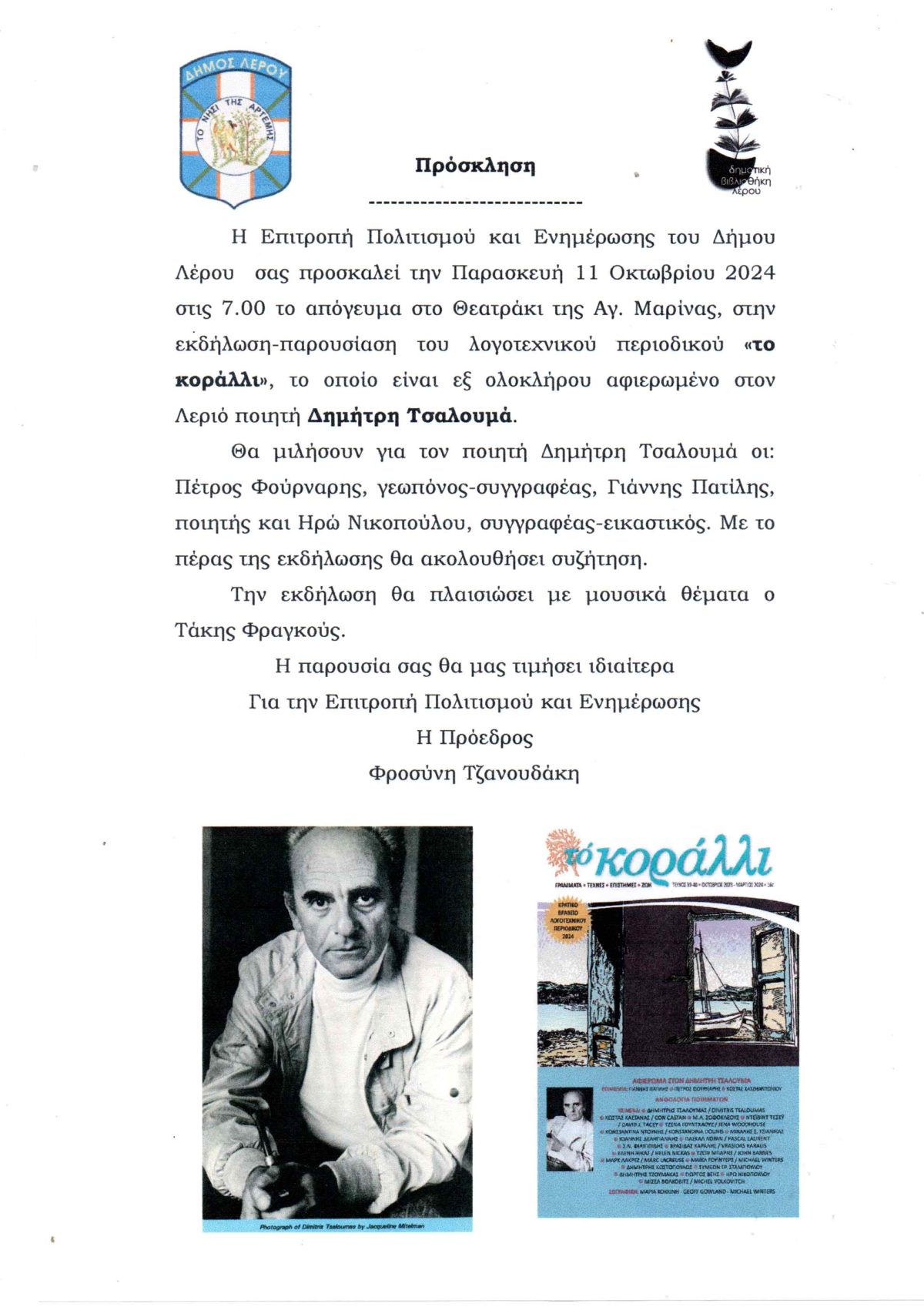 Λέρος: Πρόσκληση σε εκδήλωση από τη δημοτική Επιτροπή Πολιτισμού και Ενημέρωσης