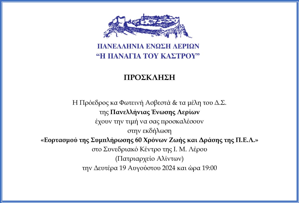 ΠΡΟΣΚΛΗΣΗ – Η Πρόεδρος κα Φωτεινή Ασβεστά & τα μέλη του Δ.Σ. της Πανελλήνιας Ένωσης Λερίων έχουν την τιμή να σας προσκαλέσουν στην εκδήλωση «Εορτασμού της Συμπλήρωσης 60 Χρόνων Ζωής και Δράσης της Π.Ε.Λ.» στο Συνεδριακό Κέντρο της Ι. Μ. Λέρου (Πατριαρχείο Αλίντων) την Δευτέρα 19 Αυγούστου 2024 και ώρα 19:00
