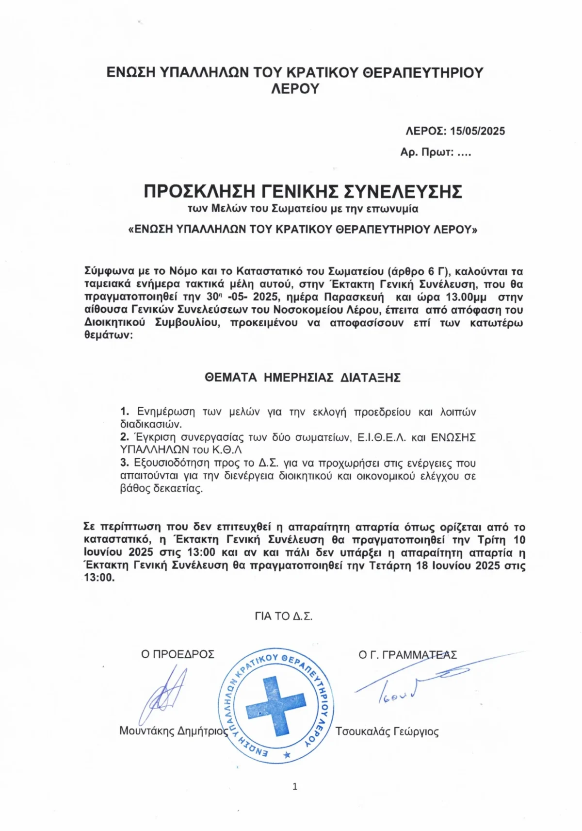Ακολουθεί παρακάτω η πρόσκληση για Έκτακτη Γενική Συνέλευση των μελών της Ένωσης Υπαλλήλων ΚΘΛ (Ε.Υ.Κ.Θ.Λ.) που θα πραγματοποιηθεί την Παρασκευή 30 Μαΐου 2025.