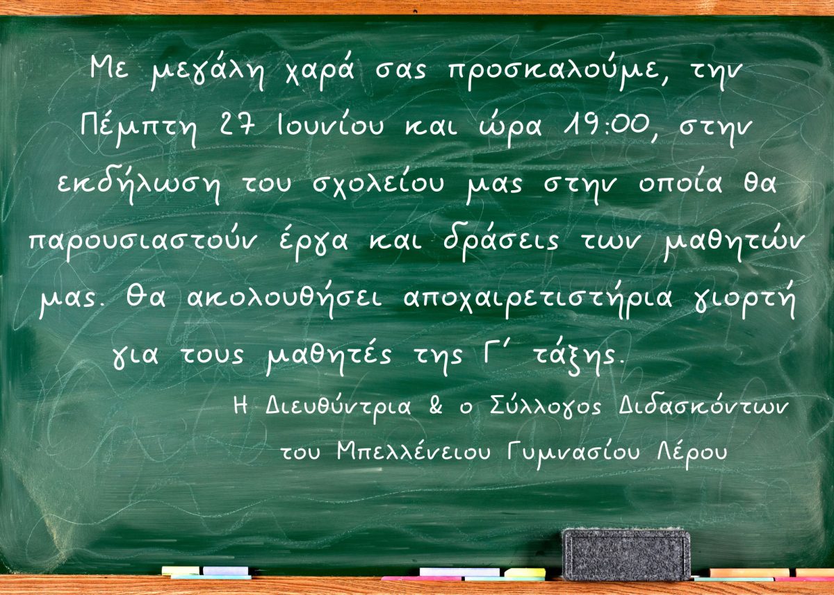 Αρχική » ΟΛΕΣ ΟΙ ΕΙΔΗΣΕΙΣ » ΤΑ ΝΕΑ ΤΗΣ ΛΕΡΟΥ » Λέρος: Πρόσκληση Καλοκαιρινής Γιορτής του Μπελλένειου Γυμνασίου