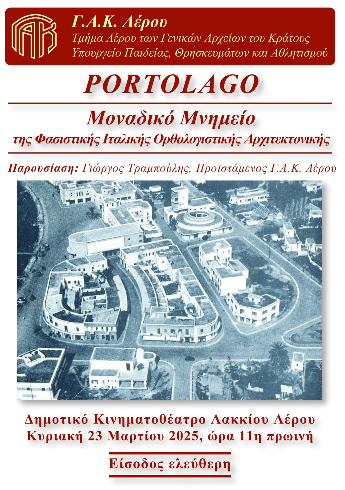 Την Κυριακή 23 Μαρτίου 2025 και ώρα 11 το πρωί ο προϊστάμενος των Γενικών Αρχείων του Κράτους Λέρου (Γ.Α.Κ. Λέρου) σας προσκαλεί στο Δημοτικό Κινηματοθέατρο Λακκίου, σε μια παρουσίαση με θέμα: