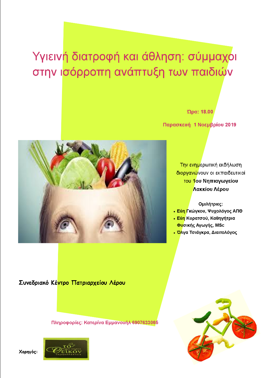 Οι εκπαιδευτικοί του 1ου Νηπιαγωγείου Λακκίου, σας προσκαλούμε στην ενημερωτική Εκδήλωση με θέμα «Υγιεινή διατροφή και άθληση: σύμμαχοι στην ισόρροπη ανάπτυξη παιδιών», η οποία θα πραγματοποιηθεί την Παρασκευή 1 Νοεμβρίου 2019 και ώρα 18:00 στο σύγχρονο Συνεδριακό Κέντρο του Πατριαρχείου Λέρου, στο Κριθώνι.