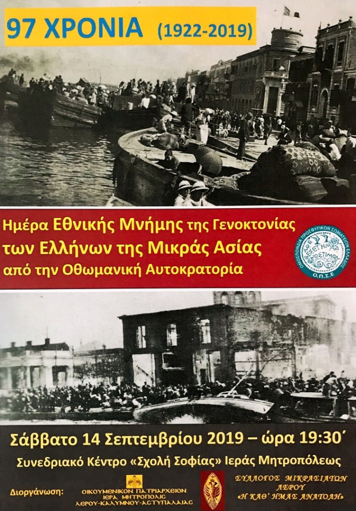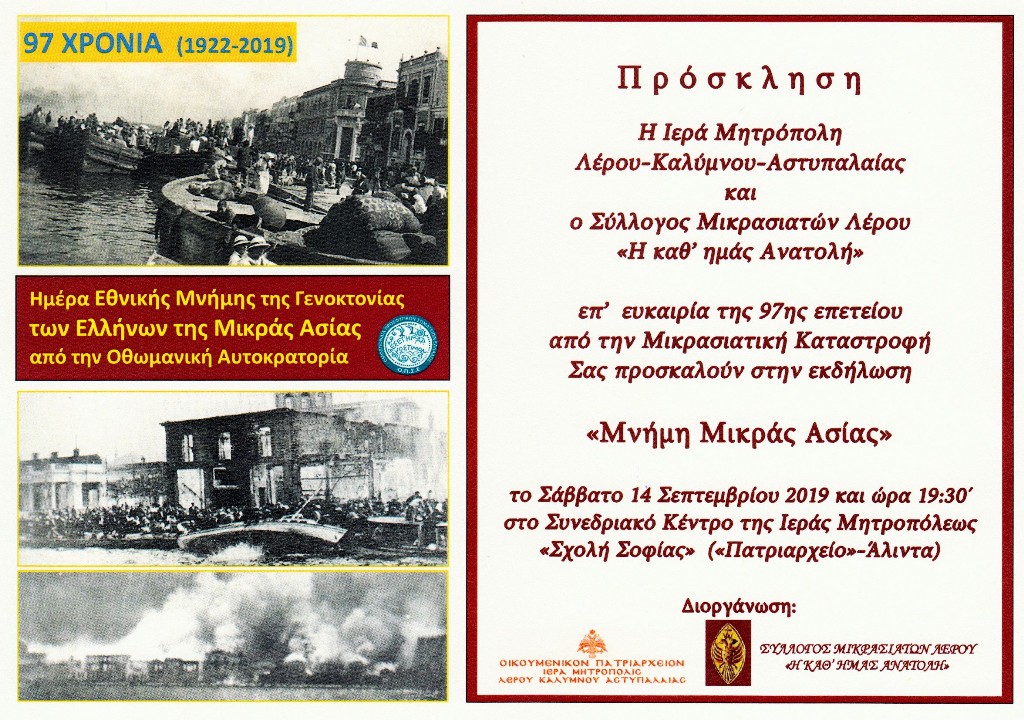Η Ιερά Μητρόπολη Λέρου-Καλύμνου-Αστυπαλαίας και ο Σύλλογος Μικρασιατών Λέρου «Η καθ’ ημάς Ανατολή», επ’ ευκαιρία της 97ης επετείου από την Μικρασιατική Καταστροφή, Σας προσκαλούν στην εκδήλωση «Μνήμη Μικράς Ασίας», το Σάββατο 14 Σεπτεμβρίου 2019 και ώρα 19:30΄, στο Συνεδριακό Κέντρο της Ιεράς Μητροπόλεως «Σχολή Σοφίας» («Πατριαρχείο»-Άλιντα).