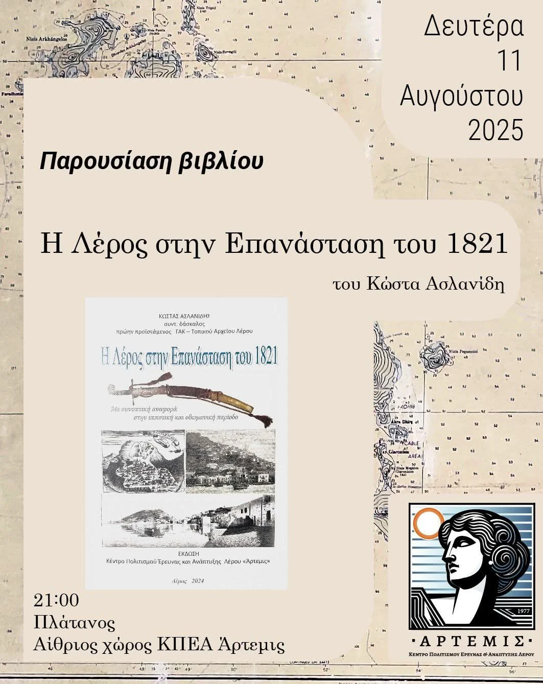 Με χαρά σας προσκαλούμε στην παρουσίαση του νέου βιβλίου του Κώστα Ασλανίδη, με τίτλο «Η Λέρος στην Επανάσταση του 1821», που θα πραγματοποιηθεί τη Δευτέρα 11 Αυγούστου 2025 και ώρα 21:00, στον αίθριο χώρο του ΚΠΕΑ Άρτεμις, στον Πλάτανο Λέρου.