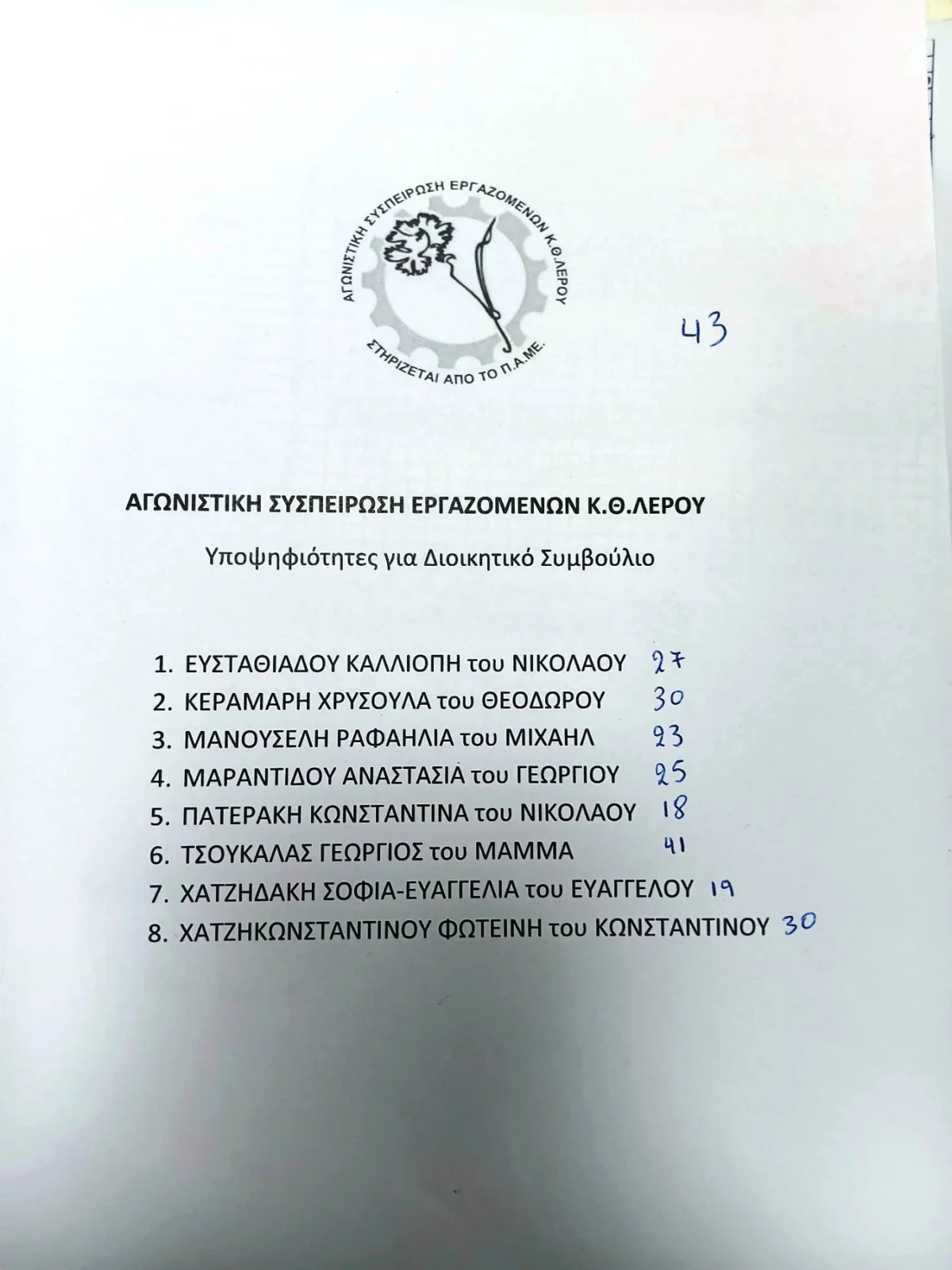 3. “ΑΓΩΝΙΣΤΙΚΗ ΣΥΣΠΕΙΡΩΣΗ ΕΡΓΑΖΟΜΕΝΩΝ Κ.Θ.ΛΕΡΟΥ” , έλαβε: 43 ψήφους και 1 έδρα