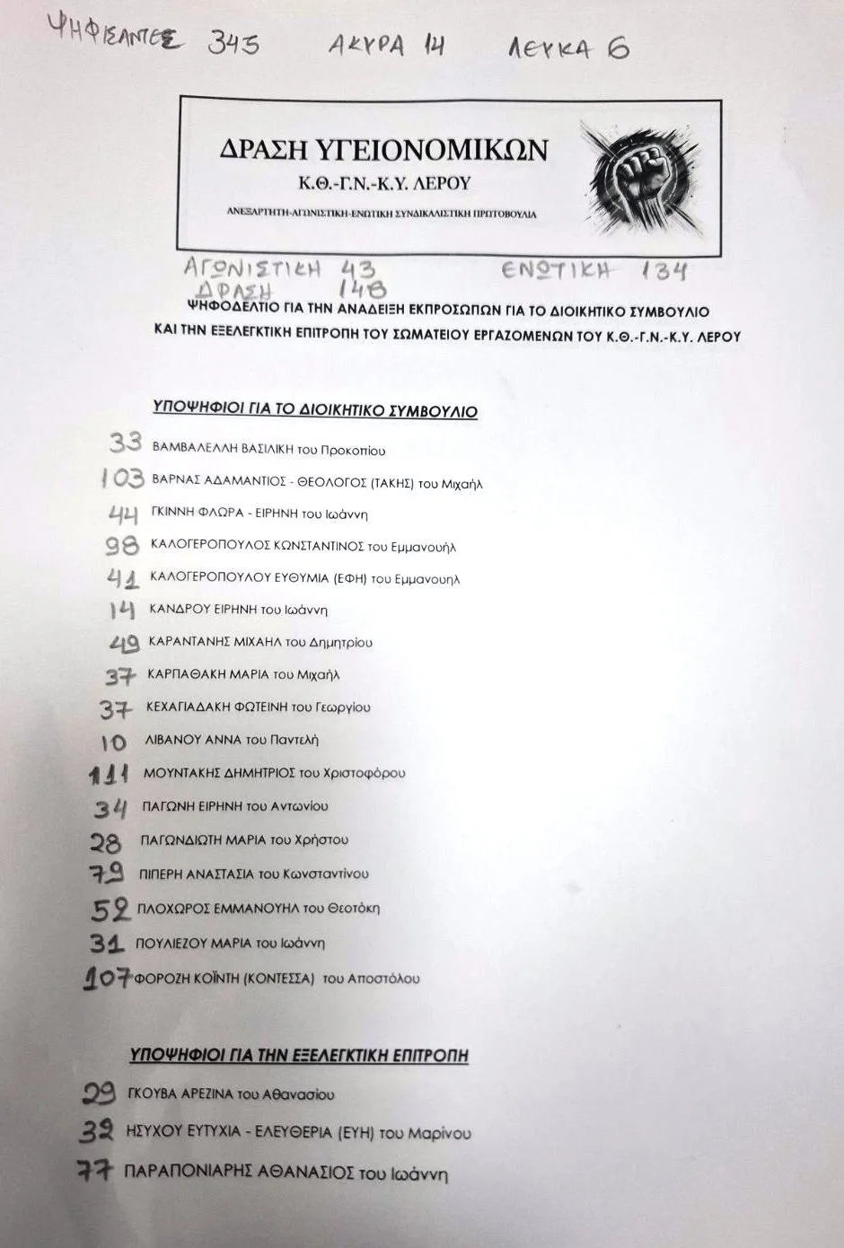 1. “ΔΡΑΣΗ ΥΓΕΙΟΝΟΜΙΚΩΝ Κ.Θ. – Γ.Ν. – Κ.Υ. ΛΕΡΟΥ Ανεξάρτητη – Αγωνιστική – Ενωτική – Συνδικαλιστική Πρωτοβουλία”, έλαβε: 148 ψήφους και 4 έδρες
