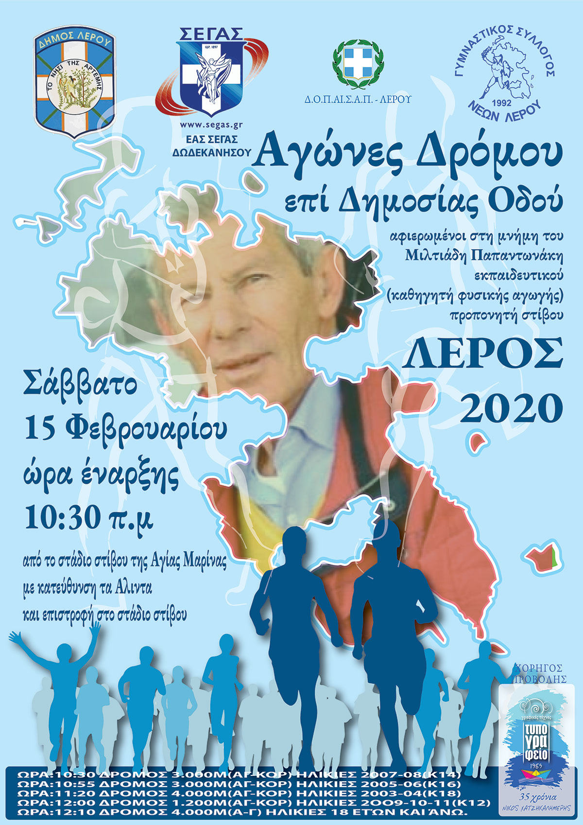 – To αγωνιστικό πρόγραμμα θα ξεκινήσει το πρωί του Σαββάτου (10:30) και θα ολοκληρωθεί στις 12:30. Αμεσως μετά τις απονομές στους νικητές και νικήτριες (μετάλλια-διπλώματαα στους τρεις πρώτους-τες κάθε αγώνα) ο Δήμαρχος και τα μέλη του Δ. Σ. θα ανακοινώσουν την απόφαση του Δ. Σ. για την ονοματοδοσία του Σταδίου στον Μιλτιάδη Παπαντωνάκη, εκπαιδευτικό, καθηγητή φυσικής αγωγής και προπονητή του Γ.Σ.Ν. Λέρου, στη μνήμη του οποίου είναι αφιερωμένοι οι αγώνες.