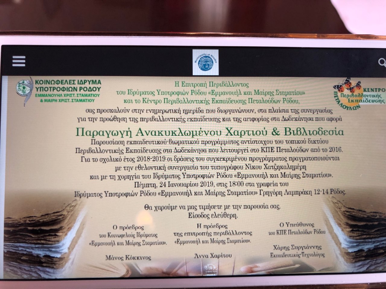 Την Πέμπτη 14.2.2019 εκπαιδευτικοί και μαθητές του ΕΠΑΛ ΛΕΡΟΥ επισκέφθηκαν στο γραφείο του, τον Δήμαρχο Λέρου κ. Μιχάλη Κόλια, για να τον ενημερώσουν σχετικά με την προσπάθεια προώθησης της περιβαλλοντικής εκπαίδευσης και της αειφορίας, σε συνεργασία με το Ίδρυμα Υποτροφιών Ρόδου “ΕΜΜΑΝΟΥΗΛ και ΜΑΙΡΗΣ ΣΤΑΜΑΤΙΟΥ” και το Κέντρο Περιβαλλοντικής Εκπαίδευσης Πεταλούδων Ρόδου, που αφορά στην παραγωγή ανακυκλωμένου χαρτιού και στη βιβλιοδεσία στο ΕΠΑΛ Λέρου.