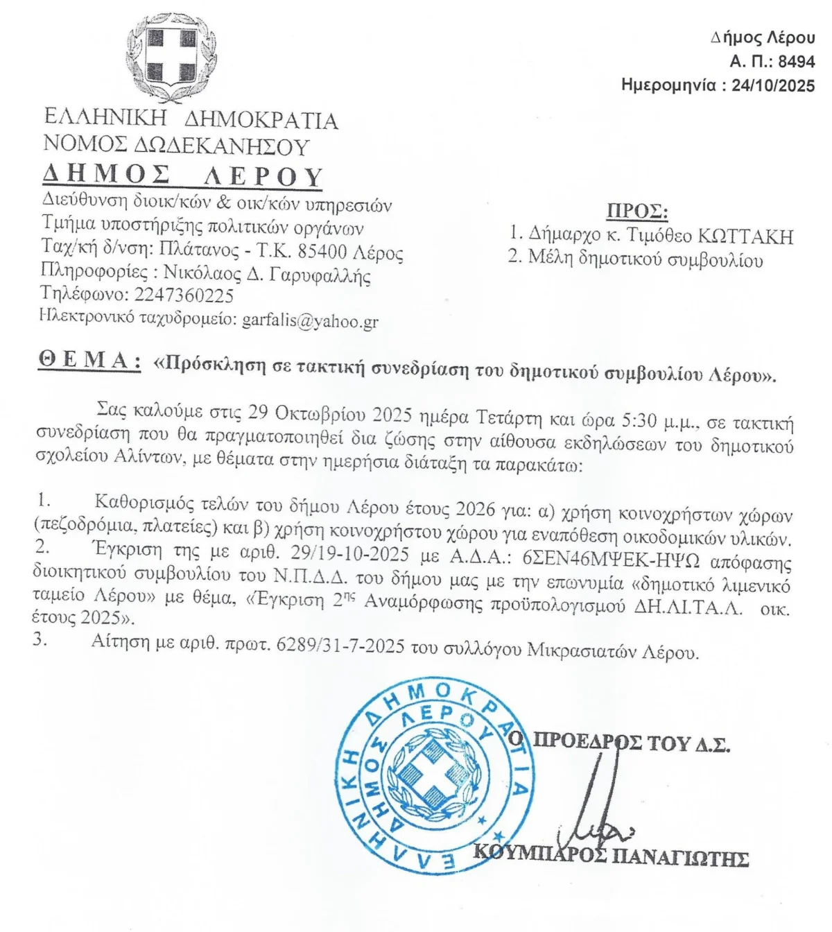 Την Τετάρτη 29 Οκτωβρίου 2025 και ώρα 5:30 μ.μ., θα συνεδριάσει το Δημοτικό Συμβούλιο Λέρου σε τακτική συνεδρίαση που θα πραγματοποιηθεί δια ζώσης στην αίθουσα εκδηλώσεων του Δημοτικού Σχολείου Αλίντων.