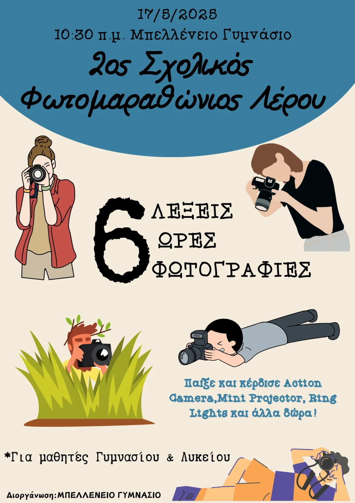 Το Μπελλένειο Γυμνάσιο Λέρου διοργανώνει τον “2ο Σχολικό Φωτομαραθώνιο Λέρου” στο πλαίσιο της ολοκλήρωσης του Eκπαιδευτικού Oμίλου «Μπες στο Κάδρο» και καλεί μαθητές Γυμνασίου και Λυκείου του νησιού μας να λάβουν μέρος σε αυτόν.