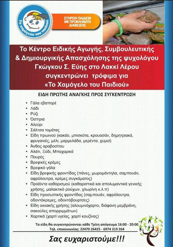Από την ερχόμενη Τρίτη 24 Μαρτίου και κάθε Τρίτη 4-8 , στο κέντρο ειδικής Αγωγής , συμβουλευτικής και δημιουργικής απασχόλησης της κυρίας Γκώγκου Σ. Εύης , κλινικής ψυχολόγου, στο Λακκι, θα πραγματοποιείται συγκομιδή βασικών ειδών πρώτης ανάγκης για ΤΟ ΧΑΜΌΓΕΛΟ ΤΟΥ ΠΑΙΔΙΟΥ.