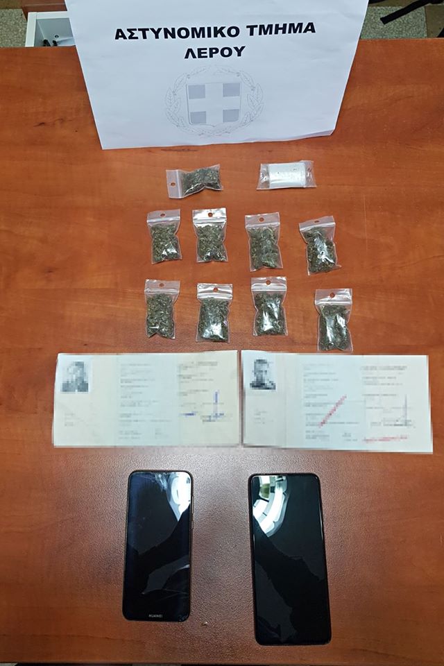 Την Παρασκευή 27-12-2019 το απόγευμα συνελήφθησαν στη Λέρο, από αστυνομικούς του Αστυνομικού Τμήματος Λέρου, δυο αλλοδαποί ηλικίας 19 και 21 ετών οι οποίοι είχαν αποκρύψει επιμελώς σε δασώδη περιοχή ποσότητα ακατέργαστης κάνναβης βάρους 33,7 γρ., καθώς και πλαστικές μικροσυσκευασίες κενές περιεχομένου.