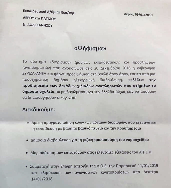 Με αντιπροσωπεία διαμαρτυρόμενων αναπληρωτών εκπαιδευτικών είχε συνάντηση ο Δήμαρχος Λέρου Μιχάλης Κόλιας, οι οποίοι και του παρέδωσαν ψήφισμα διαμαρτυρίας για την επικείμενη ψήφιση στη Βουλή Νομοσχεδίου που αλλάζει το σύστημα διορισμού (μονίμων εκπαιδευτικών) και προσλήψεων αναπληρωτών <<κλέβοντας >> την προϋπηρεσία των δεκάδων χιλιάδων αναπληρωτών που στήριξαν το Δημόσιο Σχολείο, περιπλανώμενοι ανά την Ελλάδα, δίχως καν να μπορούν να δημιουργήσουν οικογένεια, όπως χαρακτηριστικά είπαν.