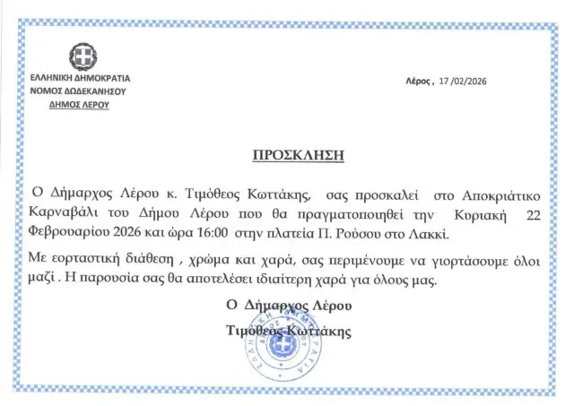 ΠΡΟΣΚΛΗΣΗ – Ο Δήμαρχος Λέρου κ. Τιμόθεος Κωττάκης, σας προσκαλεί στο Αποκριάτικο Καρναβάλι του Δήμου Λέρου που θα πραγματοποιηθεί την Κυριακή 22 Φεβρουαρίου 2026 και ώρα 16:00 στην πλατεία Π. Ρούσσου στο Λακκί.