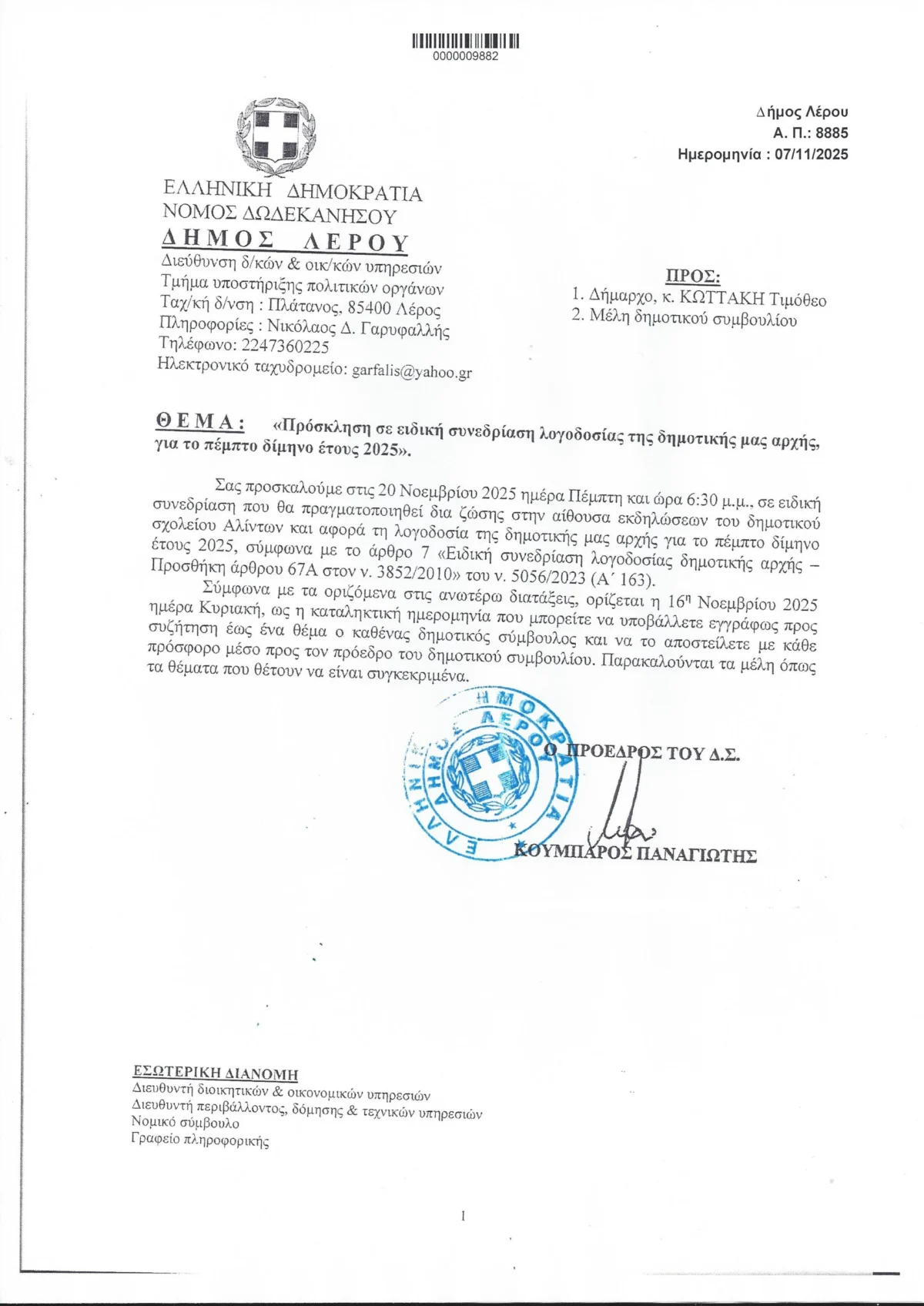 Ο πρόεδρος του δημοτικού συμβουλίου Λέρου κ. Κουμπάρος Παναγιώτης απέστειλε πρόσκληση για ειδική συνεδρίαση του δημοτικού συμβουλίου, η οποία θα πραγματοποιηθεί δια ζώσης στις 20 Νοεμβρίου 2025 ημέρα Πέμπτη και ώρα 6:30 μ.μ. στην αίθουσα εκδηλώσεων του δημοτικού σχολείου Αλίντων και αφορά τη λογοδοσία της δημοτικής μας αρχής για το πέμπτο δίμηνο του έτους 2025.