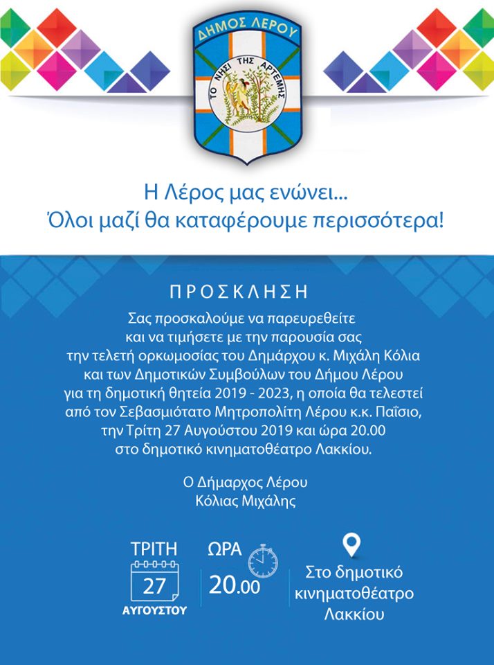«Με μεγάλη χαρά προσκαλώ τους δημότες αλλά και τους επισκέπτες του νησιού να τιμήσουν με την παρουσία τους την ορκωμοσία της νέας Δημοτικής Αρχής του Δήμου Λέρου.